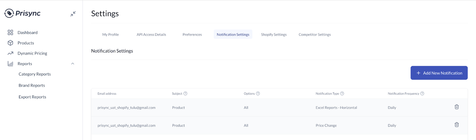 Prisync sends daily price change emails, keeping you updated even if you can’t log in frequently. You can set five different types of notifications from your panel: Price Change, where you can set a threshold to receive alerts for specific price changes; Excel & CSV Reports, which send detailed spreadsheets to your preferred email; Favorite Products, notifying you of price changes for selected items; Stock Change, providing daily updates on stock variations and MAP Monitoring, available in the Platinum Plan, alerting you if resellers list prices below your recommended price.