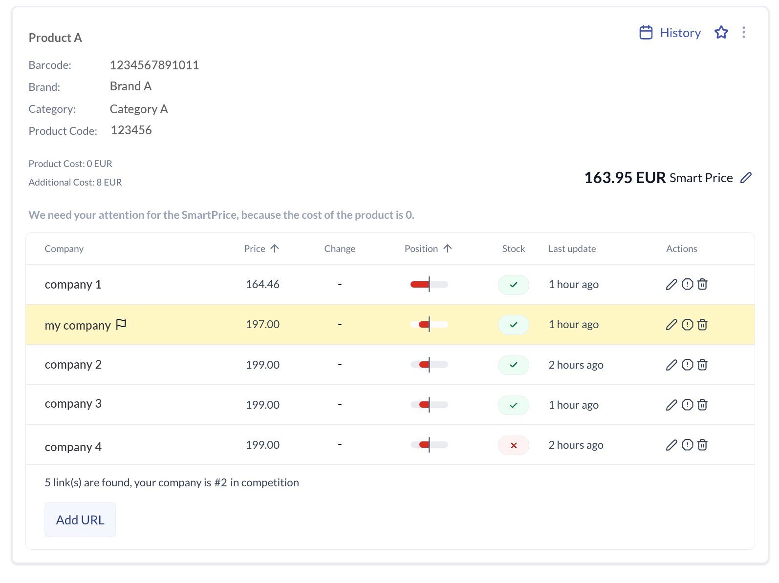 As you can see from a product’s detailed dashboard, it is visible that if certain competitor(s) are out of stock in some of the products you’re in stock. This will put you in a very advantageous position when you want to increase your prices and get fatter profits.